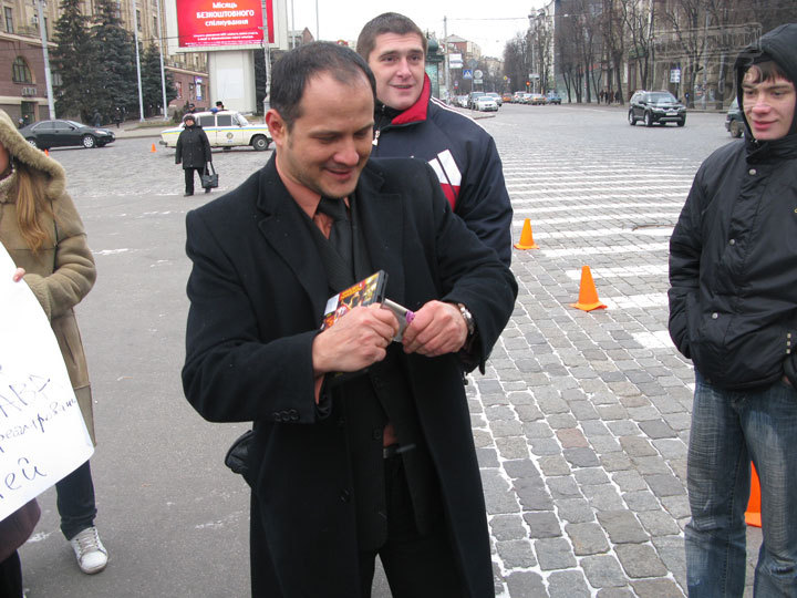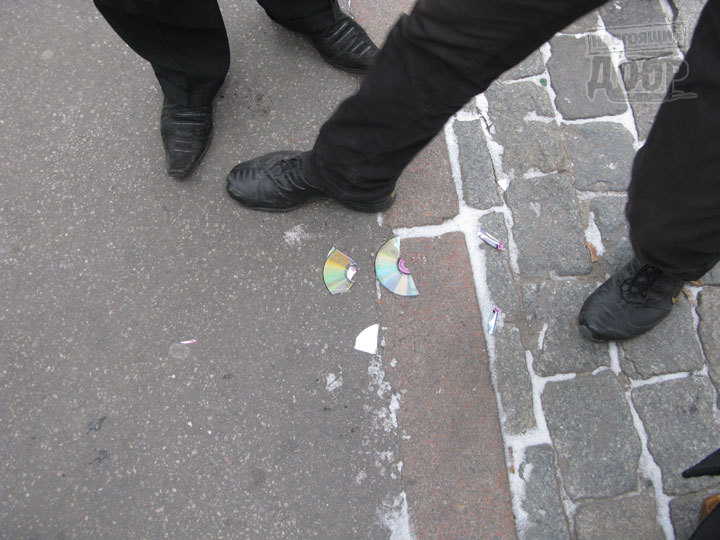 На площади Свободы в Харькове прошла немногочисленная акция протеста против продажи в городе нелицензионных дисков. Один из юристов, участвующих в акции, правозащитник Александр Каряка демонстративно разломал нелегальный диск.