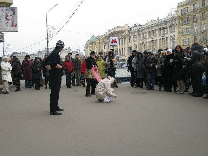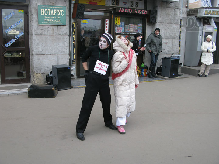 В ходе перфоманса против недобросовестных иностранных работодателей перед входом в «Детский мир» на пл.Конституции злой клоун с табличкой «Работа за рубежом» долго соблазнял девушку в розовых очках уехать работать за границу, после чего «зарезал» предметом, символизирующим не то нож, не то шприц. Затем появился другой злодей, обозначенный как «Реальный заработок». Он склонил девушку к занятиям проституцией, после чего она родила ребенка, и немного погодя все троица «ушла в закат», удалившись со сцены.