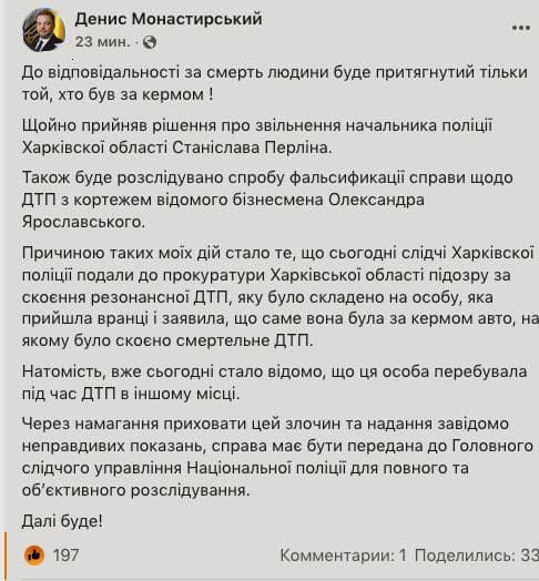 «Причиной таких моих действий стало то, что сегодня следователи Харьковской полиции подали в прокуратуру Харьковской области подозрение за совершение резонансного ДТП, которое было составлено на пришедшее утром лицо и заявило, что именно оно было за рулем авто, на котором было совершено смертельное ДТП . В то же время, уже сегодня стало известно, что этот человек находился во время ДТП в другом месте», – написал Денис Монастырский.