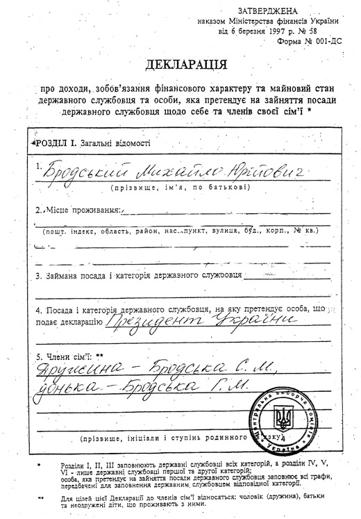 Миллионер Михаил Бродский, лидер Партии вольных демократов, – один из самых богатых кандидатов на пост президента среди всех зарегистрированных соискателей. В 2008 году он заработал 18 млн. 604 тыс. 335 грн 73 коп. Больше оказалось за 2008 год лишь у Сергея Тигипко – 20 млн. грн