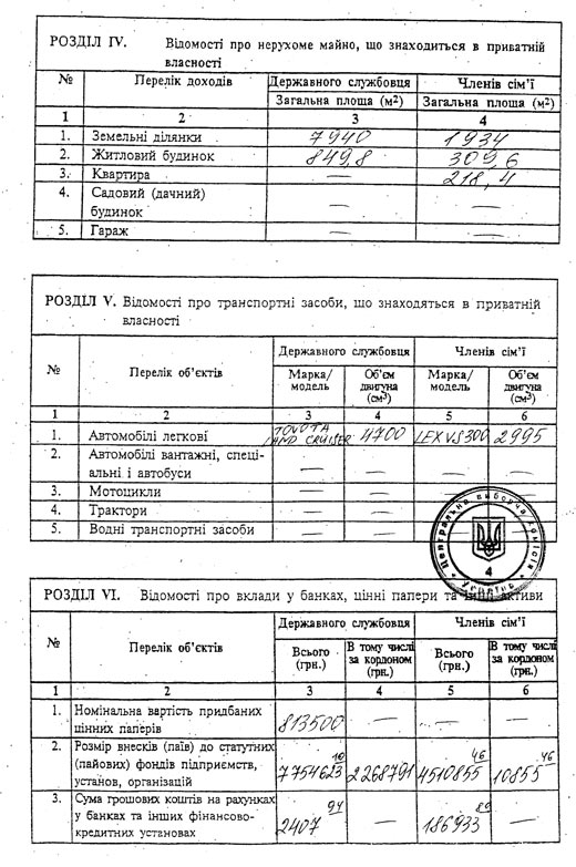 В собственности Бродского находится земельный участок в 7 940 кв.м, дом (849,8 кв. м) и автомобиль Toyota Land Cruiser (объем двигателя – 4,7 л). На банковском счету Бродского лежит 2 тыс. 407 грн; 7 млн. 754 тыс. грн вложено в уставные фонды предприятий и организаций.