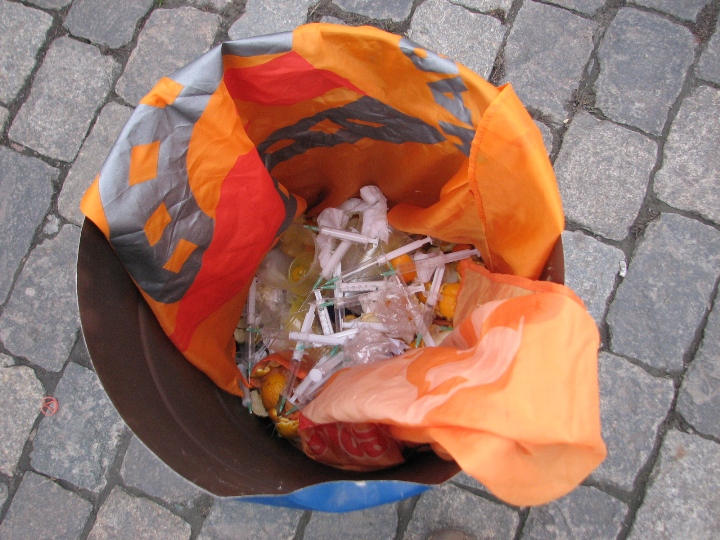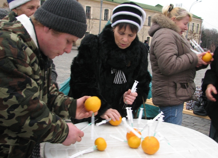 В качестве символики – на столе апельсинки с воткнутыми в них шприцами-«пятерочками». Рядом плакаты: «5 лет со дня Майдана – пять лет в трубу», «Не дай Боже Вона переможе», «Юля, достань свои руки из наших карманов».