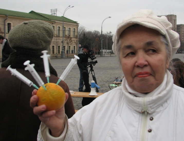 Пять лет в трубу – с этим лозунгом вышли на площадь активисты организации. Они раздают листовки, где пропечатана сравнительная характеристика обещаний 2004 года и «невыносимой легкости бытия» нынешних времен.