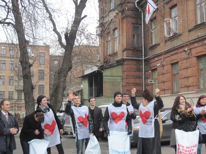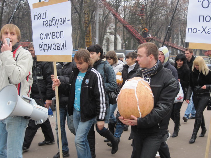 Подарок на всякий случай подкрепили плакатами, где черным по-белому написано, чего харьковчане хотят от Юлии Тимошенко: «Юля! Хватит свататься к народу!», «Наші гарбузи – символ відмови», «От ворот поворот по-харьковски».