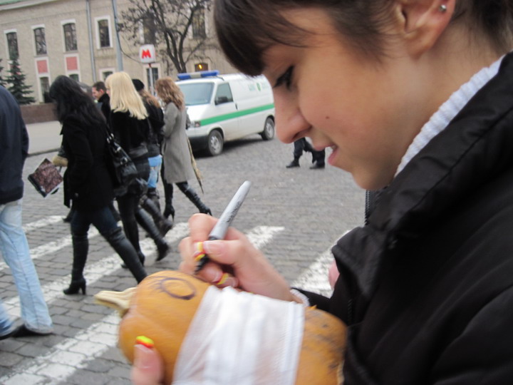 Как рассказал корреспонденту «Городского Дозора» участник акции Денис Смирнов, харьковчане решили не оставаться в стороне и поздравить премьер-министра с днем рожденья. А подарок ей выбрали от души и со смыслом – несколько украинских тыкв. По мнению молодых людей, Юлия Тимошенко, которая себя позиционирует как настоящую украинку и патриотку, должна понять смысл этого подарка.