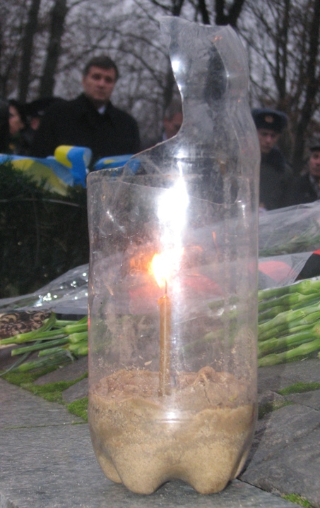 Присутствовавшие на церемонии харьковчане зажгли свечи в память о погибших в годы Голодомора и выложили символический крест из лампад.