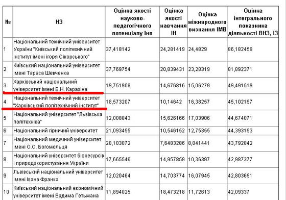 В рейтинге «ТОП-200 Украина» с учетом составляющей «Инновационная деятельность университетов» выложена на сайте центра «Еврообразование» Харьковский Национальный университет им.Каразина занял третье место в рейтинге, Национальный технический университет «ХПИ» - четвертое.