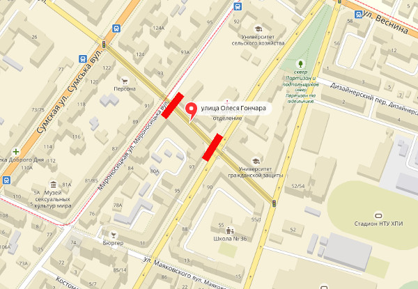 Движение транспорта по ул. Олеся Гончара, на участке от ул. Мироносицкой до ул. Чернышевской, запрещено до 17:00 19 сентября.