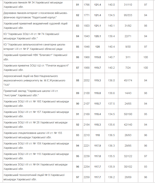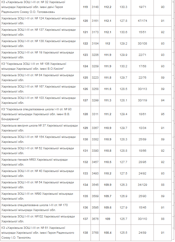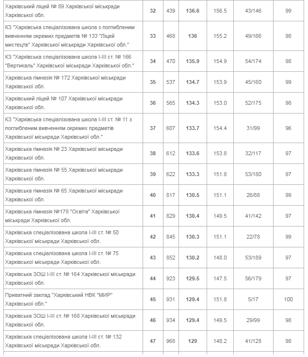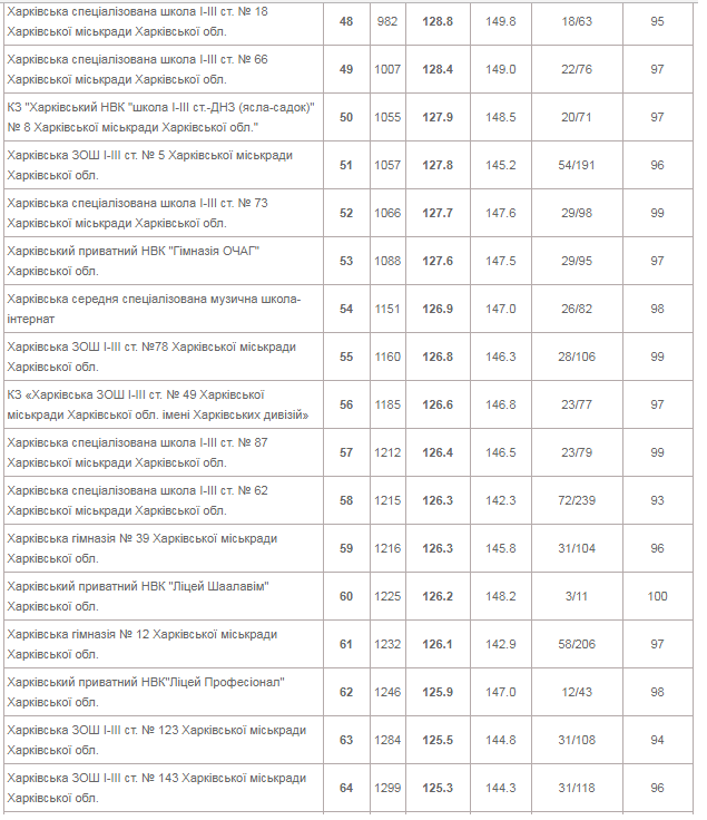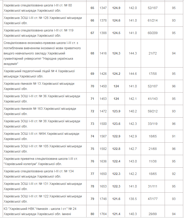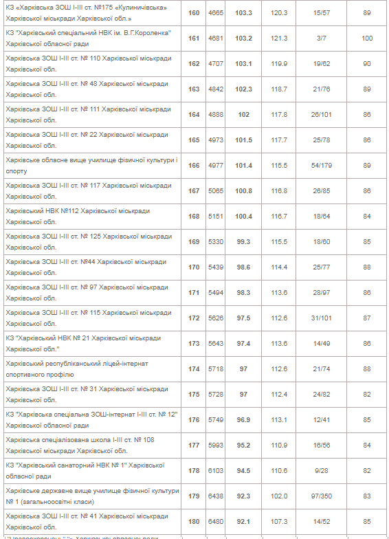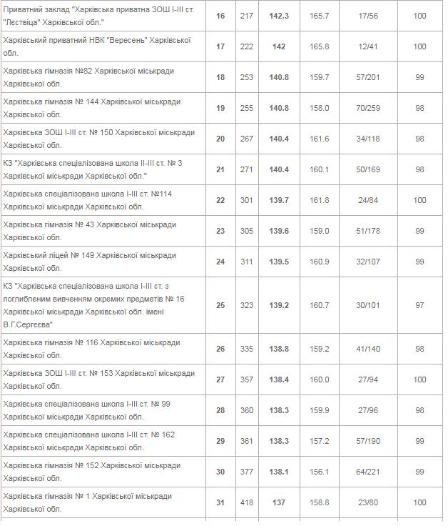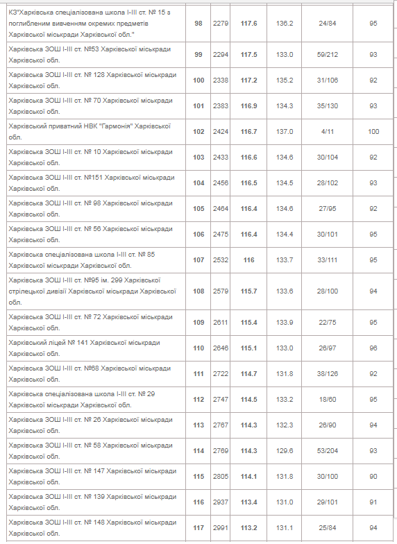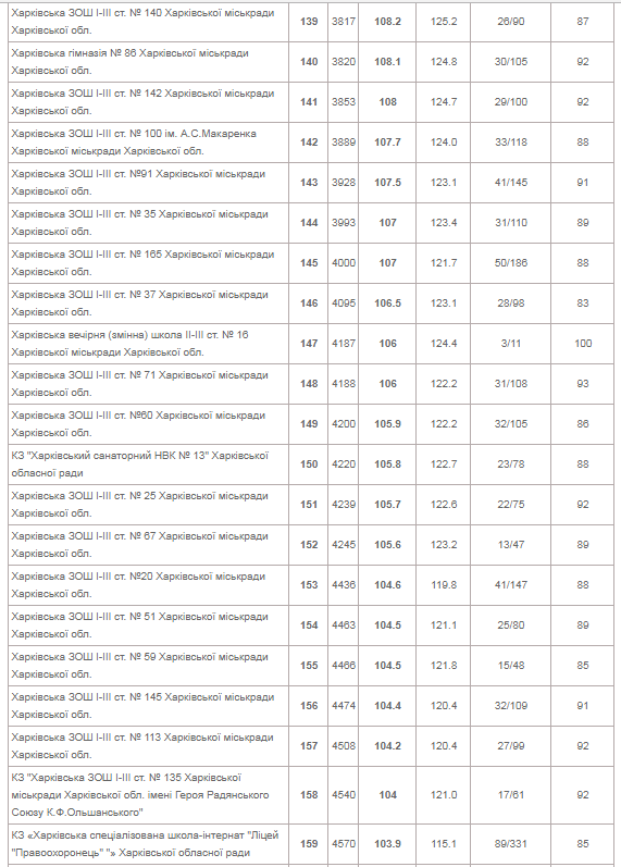 | КЗ "Харківський університетський ліцей" | 153 | 144.5 | 162.2 | 73/258 | 99 |