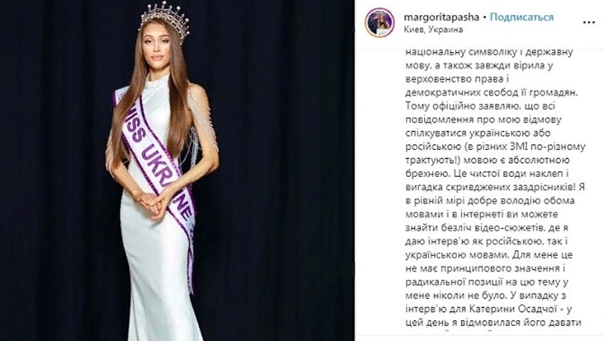 Ведущая программы «Светская жизнь» Екатерина Осадчая недавно разместила в Instagram видеоролик, в котором сообщила, что «Мисс Украина-2019» Маргарита Паша отказалась давать интервью на украинском языке. В связи с этим программа с харьковчанкой так и не выйдет в эфир, пишет «24 канал».
