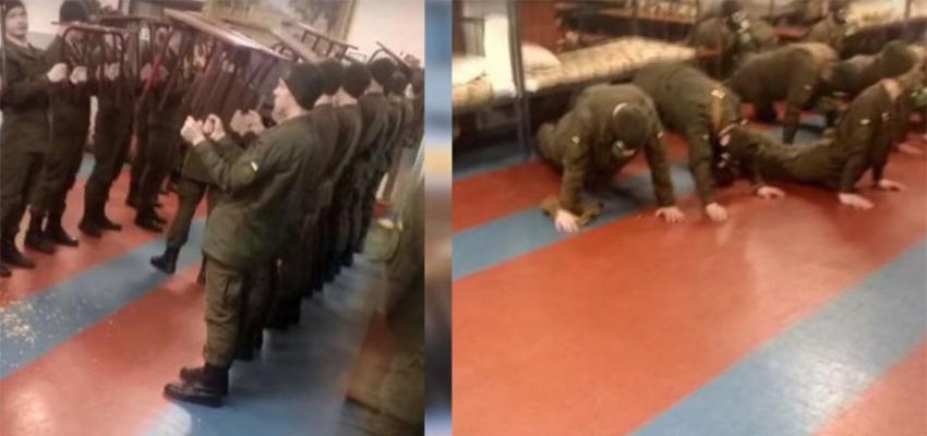По словам Стерненко, курсантов-первокурсников заставили держать табуретки за то, что у одного из них сержант обнаружил в тумбочке чипсы. Также в ролике было еще одно фото про академию – на нем курсанты отжимаются от пола в противогазах.