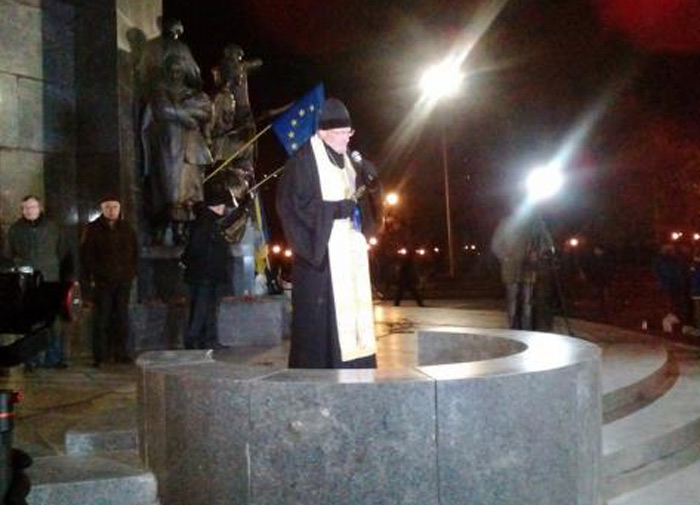 На Вече также присутствовал духовный наставник харьковского Евромайдана, настоятель храма Святого Иоанна Богослова Виктор Маринчак. Он отметил, что лозунг «Слава Украине» должен звучать не просто так, а украинцы должны сами поддерживать и распространять эту славу.