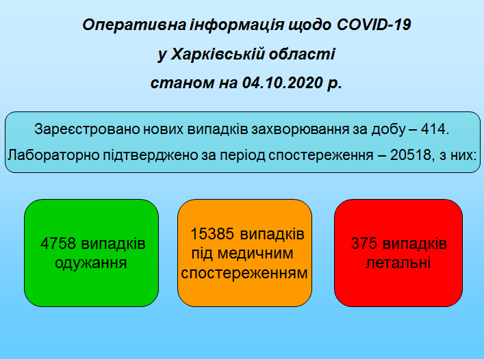 Диагноз COVID-19 за минувшие сутки подтвержден у 414 жителей Харьковщины.