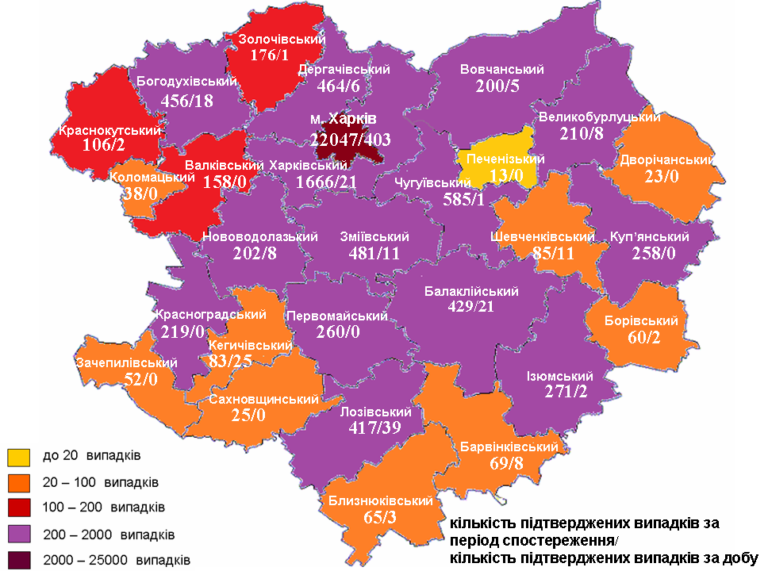 Кроме того, заболели 39 человек в Лозовском районе, 25 – Кегичевском, 21 - Балаклейском, 19 - Харьковском, 18 - Богодуховском, по 11 – Шевченковском и Змиевском, по 8 – Барвенковском, Нововодолажском и Великобурлукском, 6 - Дергачевском, 5 - Волчанском, 3 – Близнюковском, по 2 - Боровском, Изюмском, Краснокутском районах и г.Люботине, по 1 – в Чугуевском и Золочевском районах.
