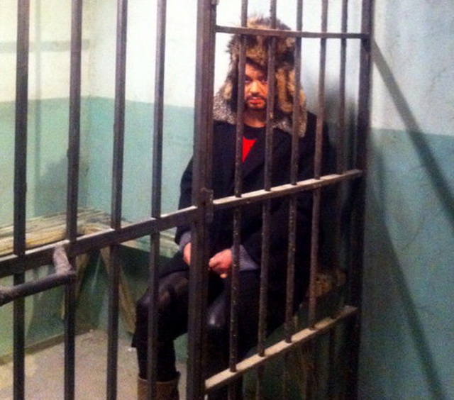 Неизвестно, каким образом артист оказался за решеткой. Видимо, фото сделано на съемках какого-то очередного телепроекта, скорее всего, новогоднего.