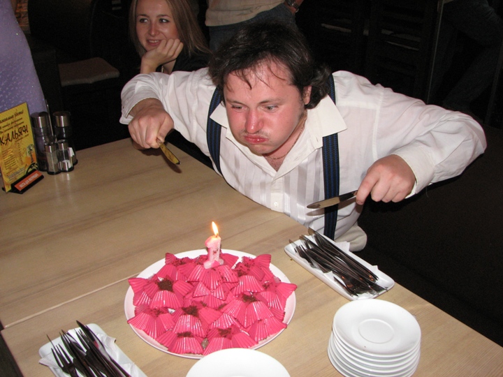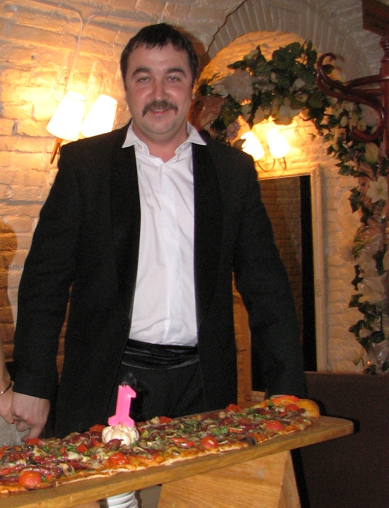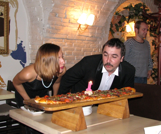После нескольких кругов игры собравшиеся отвлеклись на бонус от заведения метровой длины – пиццу с зажженной свечкой в форме единицы. Впрочем, к поглощению пиццы не приступили, пока практически каждый из игроков не задул огонь свечи.