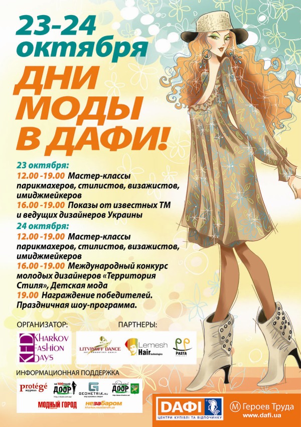 Дни моды в Дафи – это 20-ти метровый подиум, профессиональный звук и свет, презентации новых коллекций от украинских дизайнеров, конкурс молодых дизайнеров, детская мода, мастер-классы визажистов, стилистов, имиджмейкеров.