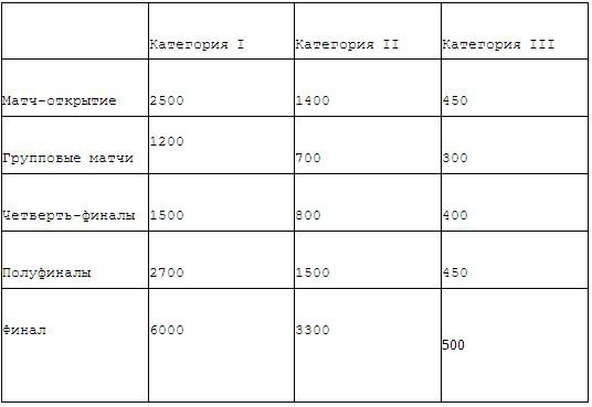 Стоимость билетов будет варьироваться от 300грн. ($37.50) до 6000грн. ($750), в зависимости от того, где расположено место, и от того, на какую из 31 игры между 16 командами в финале вы захотите пойти.