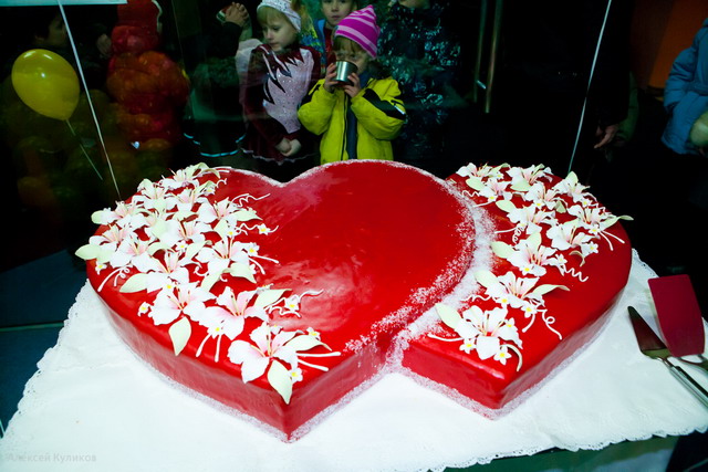 Кульминацией программы стало угощение от сладкого спонсора праздника Салтовского хлебокомбината, сотрудники которого создали настоящий шедевр кондитерского искусства – 50-киллограмовый торт в форме традиционного символа праздника: двух сердец, соединенных одним большим чувством. Попробовать это оригинальное и невероятно вкусное угощение смогли все гости вечеринки.