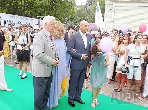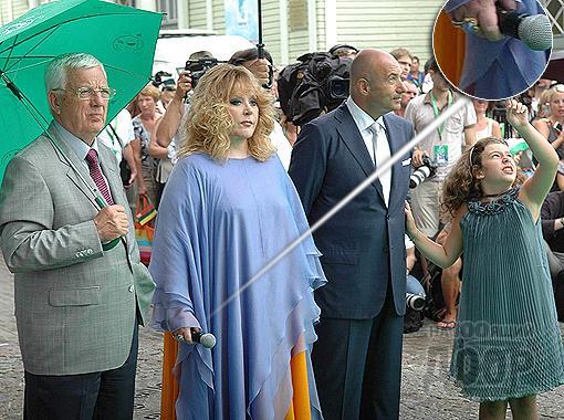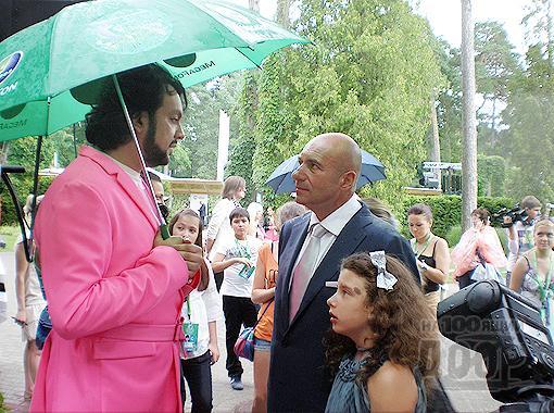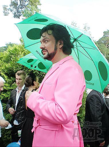 По мановению волшебной палочки зелененькие зонтики прикрыли все звездные макушки. Особенно живописно смотрелся Филипп Киркоров. Певец, облаченный в костюм ядрено-розового цвета, выглядел как праздничная карамелька. Но на самом деле артисту было не до смеха. Он мялся неподалеку от Пугачевой с большим букетом цветов, все не решаясь их подарить. А потом и вовсе отдал цветы охраннику и устремился в гримерку. По дороге Киркоров встретил Игоря Крутого, с которым принялся обсуждать инцидент на концерте в Судаке.