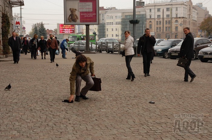 «Ботаник» трижды роняет и собирает бумаги. Ползает на коленях по асфальту и сквозь очки молчаливо взывает о помощи. Ничего не отвечают прохожие. Просто обходят «нерадивого студента» стороной. Операторы заскучали, камеры выключили.
