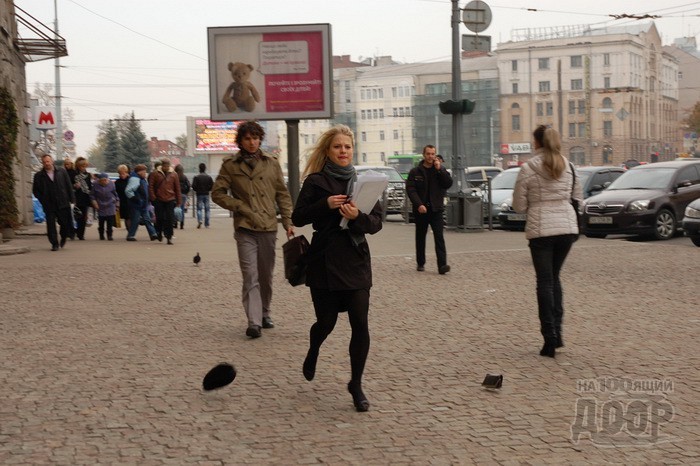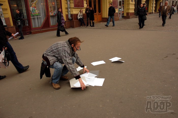 Следующая локация — недалеко от «Детского мира». По легенде, студент-«ботаник» неуклюже роняет папку. Листы бумаги разлетаются к ногам прохожих. Кто поможет собрать — тому все тот же приз.