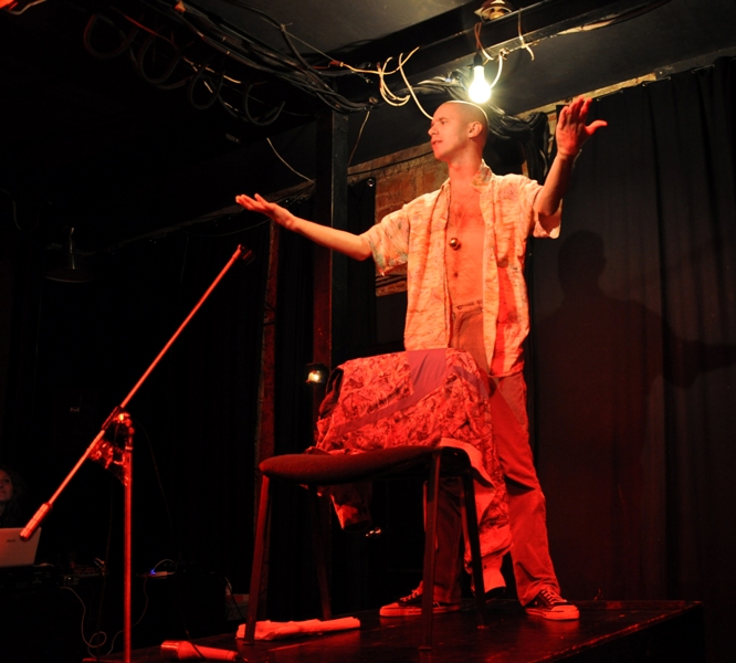 «Июль» - это моноспектакль. На сцене мы видим только Владимира Снегурченко – исполнителя главной роли и режиссера в одном лице. Свечи, колокольчик, распечатанный текст, стул и железная кочерга – реквизит и все декорации. Стоит отметить, что Снегурченко необыкновенно пластичен, он, пропуская весь текст через себя, иногда как будто «выныривает» из пьесы, чтобы не было так страшно, чтобы зрители успевали отойти от шока, который вызывает уже одно начало спектакля: «Сгорел дом, а в доме две собаки. Одна — черная, сука, дворняжка, а вторая — овчарка, полугодовалый кобель. Держал обеих в сарае, взаперти, чтобы они, не убежали, пока не доделаю забор вокруг дома, осталось -то метров пять протянуть проволоки, и все готово, но тут пожар, дом как картонка сгорел минут за двадцать, и сарай, и собаки, и все нажитое за долгие годы имущество, и документы, и деньги, и все мои планы на будущее, все обратилось в серый пепел, ничего не осталось, только я и июль месяц, посреди которого и сотворилась со мною вся эта беспощадная дребедень».