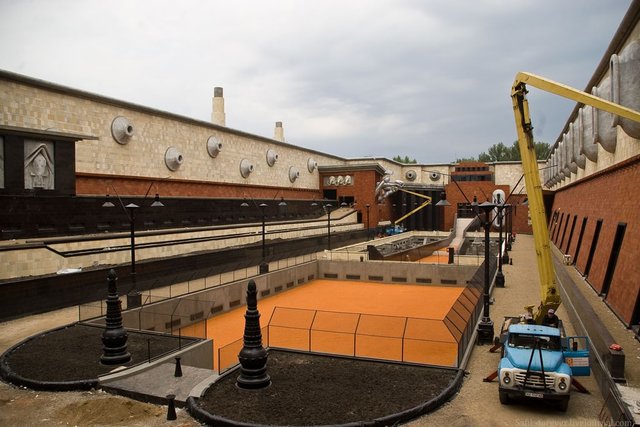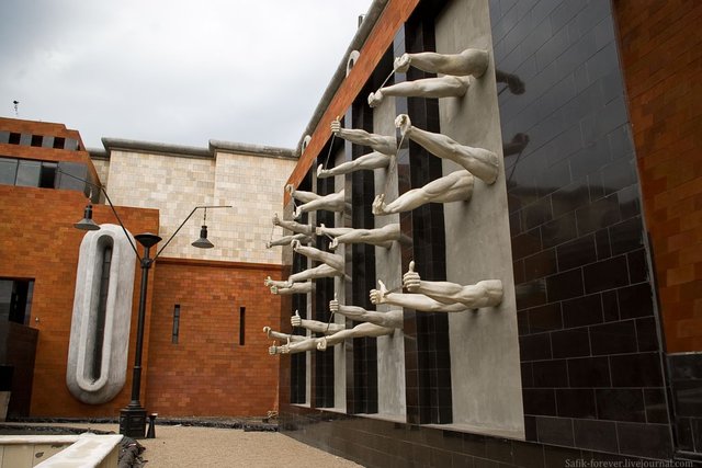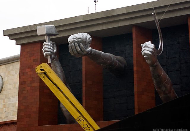 Декорации – развалины института физических проблем АН СССР, где работал Ландау, и его квартиры, разместились в открытом бассейне спорткомплекса. Жутковато выгладили серп, молот и мозг, торчащие из декораций..jpg)