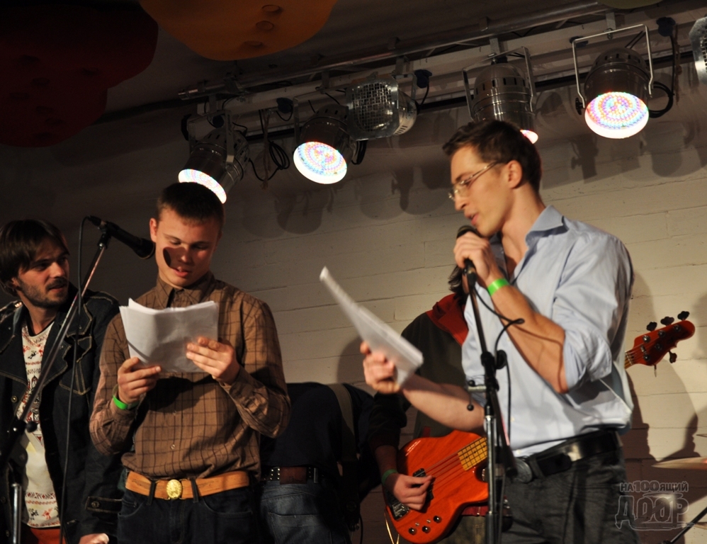 Этим вечером на сцене были не только участники «Кривоструя». Начала концерт Рита (так объявил ее Артем Воробьев). Девушка под гитару исполнила 3 песни. После ее сменили ребята из объединения «Вack to back». Алеша Безпальцев и Антон Кавайный развлекали людей шутками, пока подключались музыканты. То ли все уж очень ждали «Кривоструй» на сцене, то ли материал был выбран неподходящий – но слушатели без особого энтузиазма реагировали на то, что происходило на сцене.