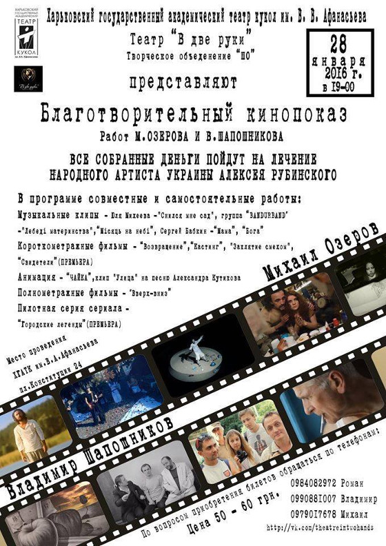 Благотворительный кинопоказ в театре кукол. Будут представлены киноработы М.Озерова и В.Шапошникова. Все собранные деньги пойдут на лечение Народного артиста Украины А. Рубинского — Короля Лира, талантливейшего из артистов современности. Где: ХГАТК им.В. А .Афанасьева. Цена 60-50 грн. Адрес: пл. Конституции 24. Начало в 19.00.