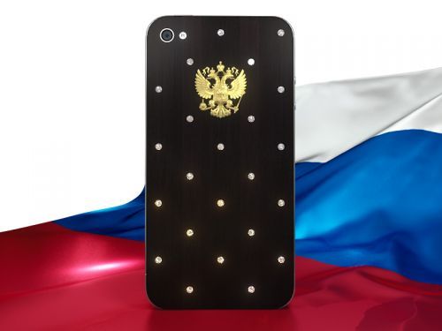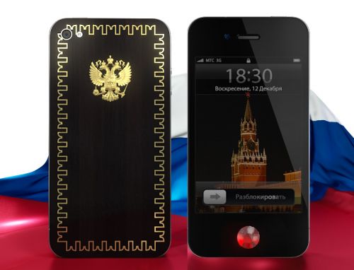 Полное название нового девайса – Apple iPhone 4 Russian Federation. Корпус двух моделей серии выполнен из дорогостоящей породы африканского дерева, украшен геральдическим символом из желтого золота и россыпью драгоценных камней.